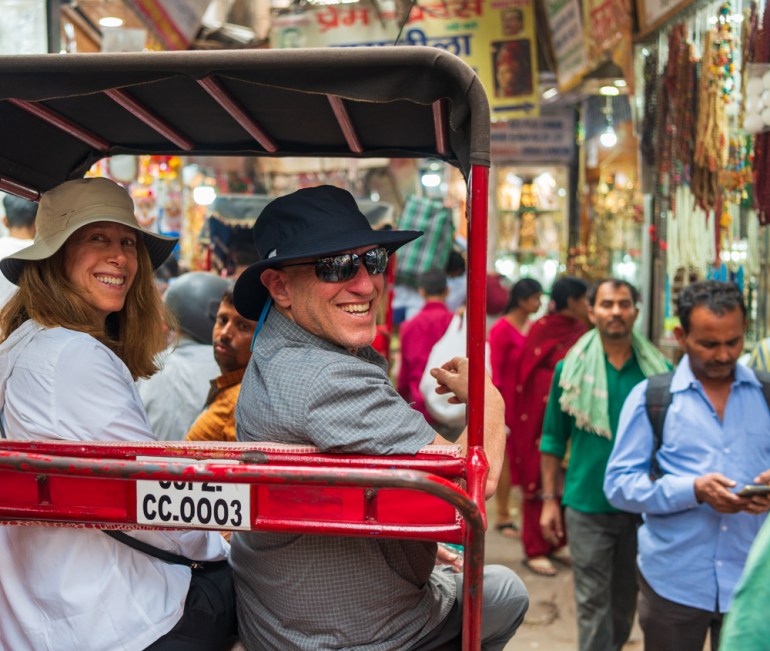 Fellow vacationers Debbie and Arnold discover the alleys of Previous Delhi by rickshaw.