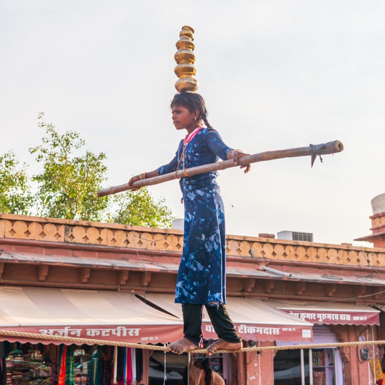 Tightrope walker within the Jodhpur metropolis market.
