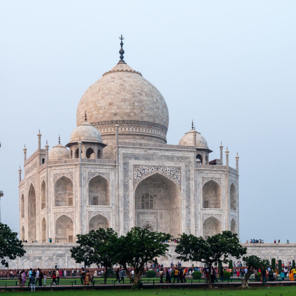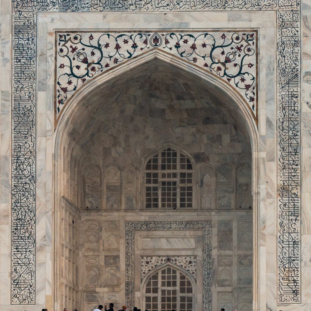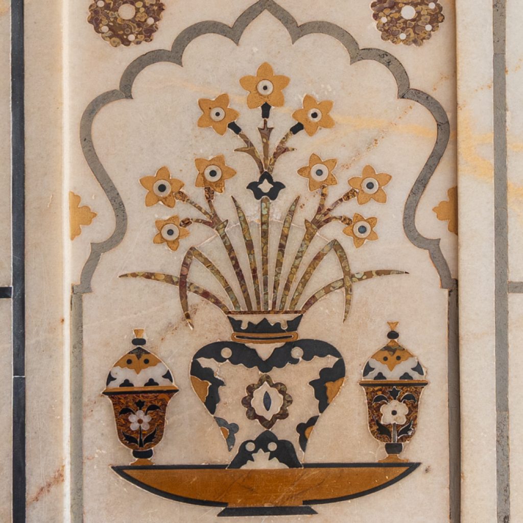 The Taj Mahal (actually, “Crown of Palaces”), declared in 2007 to be one of many New 7 Wonders of the World, is a stunningly stunning constructing in white marble (Determine 6) inlaid with semi-precious stones (Determine 7). The Mughal construction is noteworthy for excellent design proportions that make it appear from a distance to be smaller than it really is. We had the chance to go to twice, at sundown and dawn.