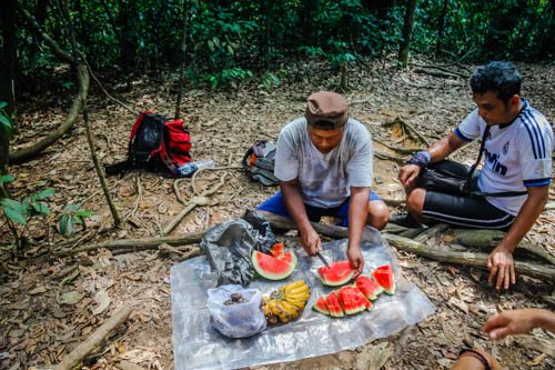 Dinner was served on the ground of the jungle close to our tents and was a whole smorgasbord of fantastic Indonesian dishes ready by Thomas and his employees. All of us sat round, together with the employees, and gorged ourselves. Between the 5 of us, we couldn’t even end the whole lot.