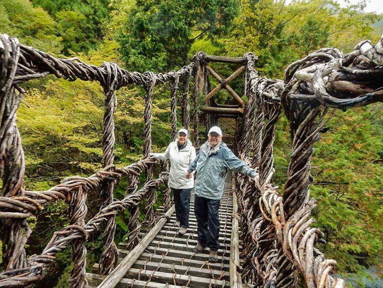 Throughout certainly one of our hikes within the Iya Valley, we crossed a kazura-bashi, a woven vine bridge, suspended over the river. These bridges had been as soon as made fully of vines that might be chopped all the way down to evade pursuing enemies. (Fortunately, they’re now strengthened with some metal beams!)