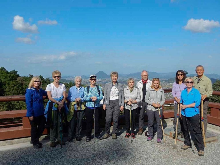 Some days had been cloudy throughout our hikes, whereas others had been vivid and sunny. Right here is our group at a lookout in Shikoku.