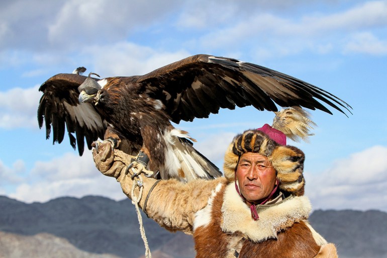 On the competition grounds, 114 hunters carrying conventional clothes parade on horseback. Hunters relaxation their forearms on baldaks (forked wood sticks fitted into their saddles) to assist their weighty eagles. All opponents line up in entrance of the judges.