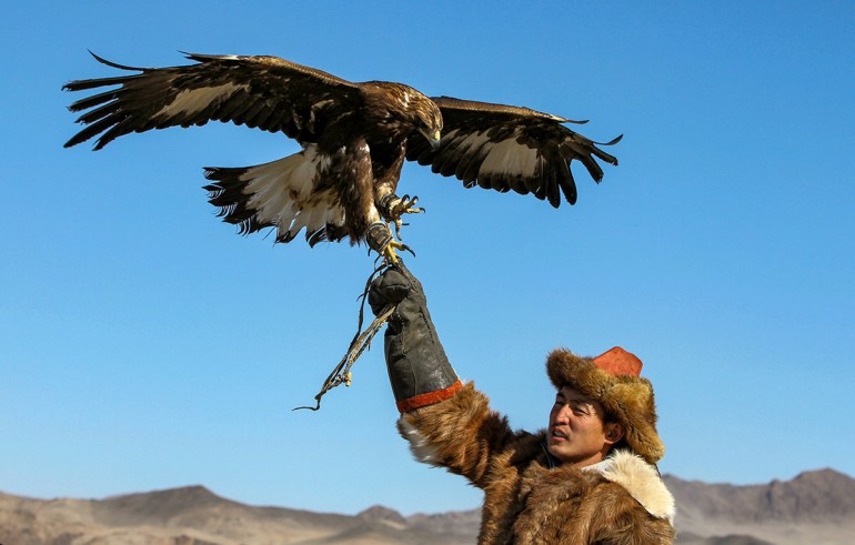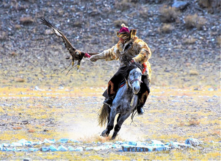 The primary rounds of competitors are fierce. Whereas a hunter rides throughout the steppe typically at break-neck pace, calling to his or her eagle, an assistant atop a close-by mountain unhoods and releases the eagle. The eagle swoops down and lands on the hunter’s raised arm, lured by a bloody lamb bone. Later, the eagles swoop once more, this time for a freshly killed rabbit the hunter drags behind the horse. Judges award factors for the way shortly the eagle reaches its hunter and the way distant the hunter is from the mountain.
